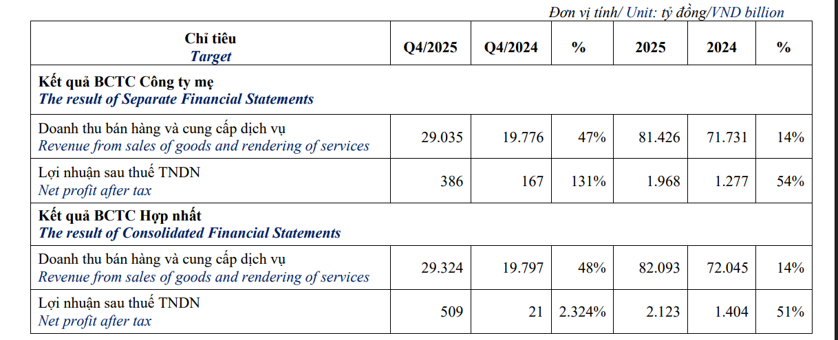 CTCP Hàng không Vietjet (VJC) vừa công bố báo cáo tài chính quý IV/2025 với doanh thu đạt 29.324 tỷ đồng, tăng 48% so với cùng kỳ năm trước. Sau khi trừ giá vốn, lợi nhuận gộp đạt hơn 1.552 tỷ đồng, tăng 50%.