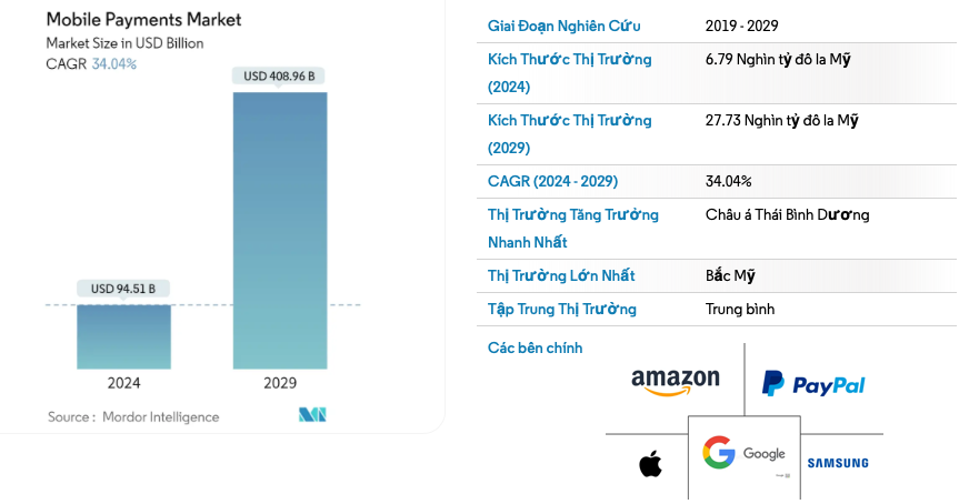 Theo Mordor Intelligence, quy mô thị trường thanh toán di động được ước tính đạt 94,51 tỷ USD vào năm 2024 và có thể tăng lên 408,96 tỷ USD vào năm 2029, với tốc độ tăng trưởng kép (CAGR) 34,04% trong giai đoạn 2024–2030. Con số này phản ánh tiềm năng lớn của thị trường thanh toán điện tử tại Việt Nam và khu vực.Miếng bánh béo bở của thanh toán trực tuyến, bao gồm cả thanh toán di động đến 400 tỷ USD trở thành sức hấp dẫn khiến các doanh nghiệp cần liên tục đổi mới để gia tăng thị phần.