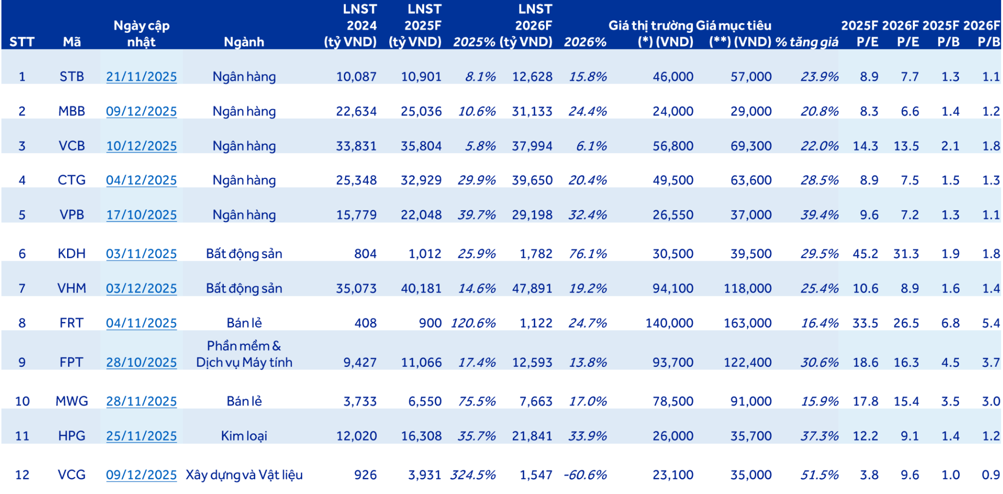 Bà Trang dự báo lợi nhuận trước thuế 2026 của những ngân hàng trong danh mục phân tích (STB, TCB, MBB, VCB, CTG,...) tăng 17,3%, cao hơn 2025 nhờ tăng trưởng tín dụng cao, NIM có khả năng cải thiện, chi phí hoạt động tiếp tục được cải thiện, dù chi phí dự phòng tăng nhẹ. Về định giá, ngành giao dịch P/E 9,8x, thấp hơn trung vị lịch sử 12,5%, tạo dư địa đầu tư trung và dài hạn.