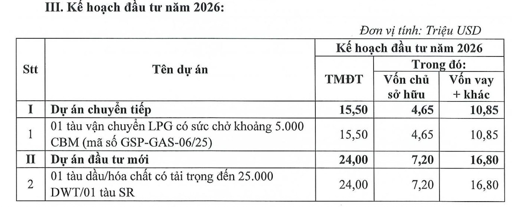 Bên cạnh đó, doanh nghiệp cũng lên kế hoạch đầu tư bổ sung tàu mới. Theo kế hoạch đầu tư năm 2026, GAS Shipping tiếp tục triển khai dự án mua 1 tàu vận chuyển LPG có sức chở 5.000CBM – kế hoạch chuyển tiếp đã được xây dựng từ trước. Tổng vốn đầu tư cho dự án này là 15,5 tỷ đồng, trong đó công ty dự kiến vay hơn 10,8 tỷ đồng.