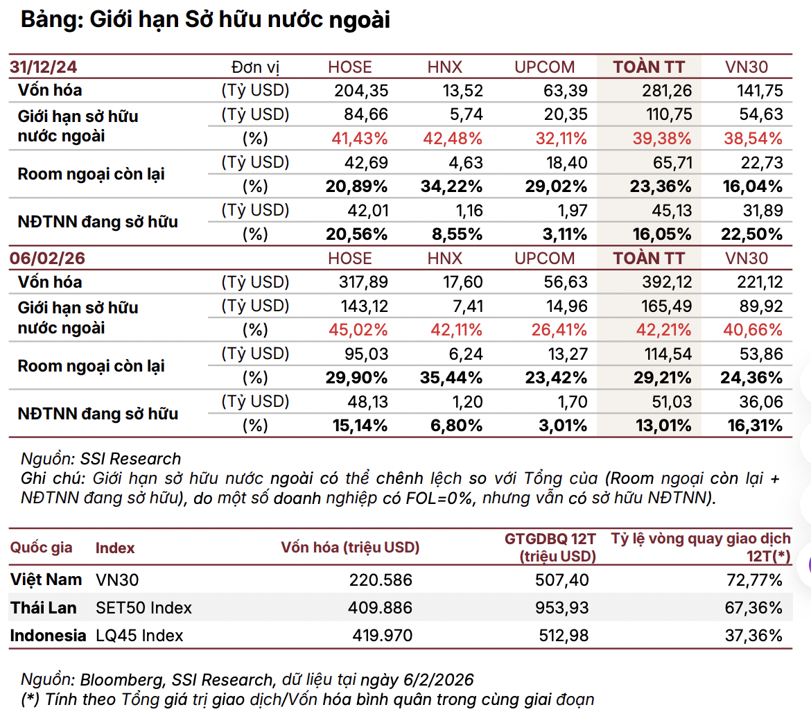 Đáng chú ý, tỷ lệ FOL toàn thị trường, đặc biệt trên HOSE, đã được cải thiện rõ rệt trong năm 2025–đầu 2026, nhờ sự gia nhập của các cổ phiếu vốn hóa lớn với room ngoại 100%. Điều này không chỉ mở rộng đáng kể tập cổ phiếu có thể đầu tư đối với các quỹ theo chỉ số, mà còn giúp cải thiện tính đại diện và độ sâu của thị trường trong các rổ chỉ số quốc tế.