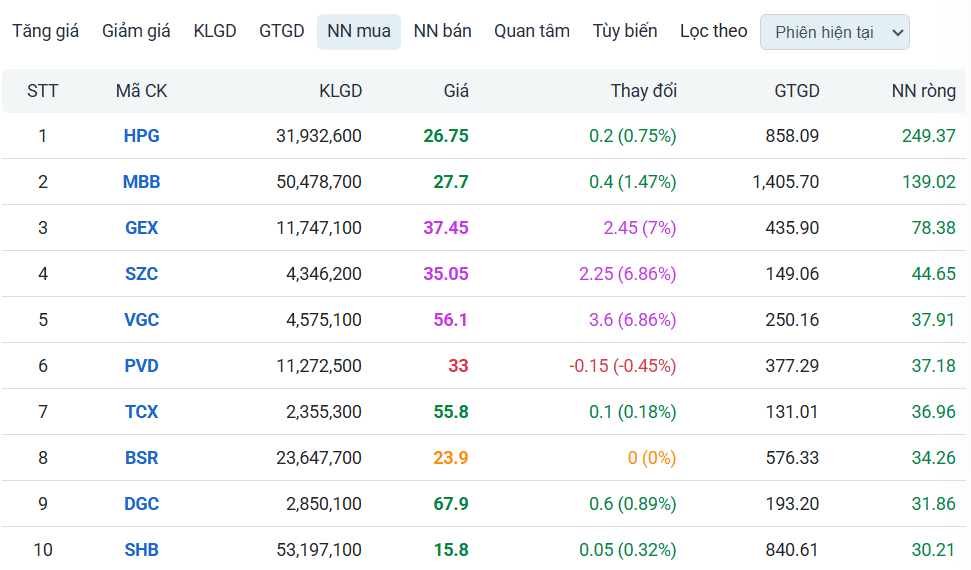 Ở chiều mua, khối ngoại tập trung giải ngân mạnh vào MBB và HPG, với giá trị mua ròng lần lượt 249 tỷ đồng và 139 tỷ đồng. Các mã còn lại trong Top mua ròng như SHB, DGC, BSR, TCX, PVD, VGC, AZC và GEX đều ghi nhận giá trị giải ngân dưới 80 tỷ đồng. Ngoại trừ PVD giảm nhẹ và BSR đứng tham chiếu, phần lớn các cổ phiếu này đều tăng giá, trong đó nhiều mã đóng cửa ở mức kịch trần.