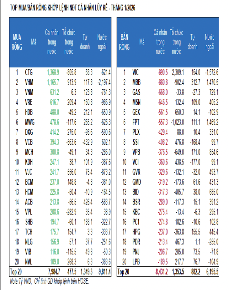 Nhà đầu tư nước ngoài bán ròng 5929.7 tỷ đồng trong tháng 1/2026, tính riêng giao dịch khớp lệnh thì họ bán ròng 4087.7 tỷ đồng.