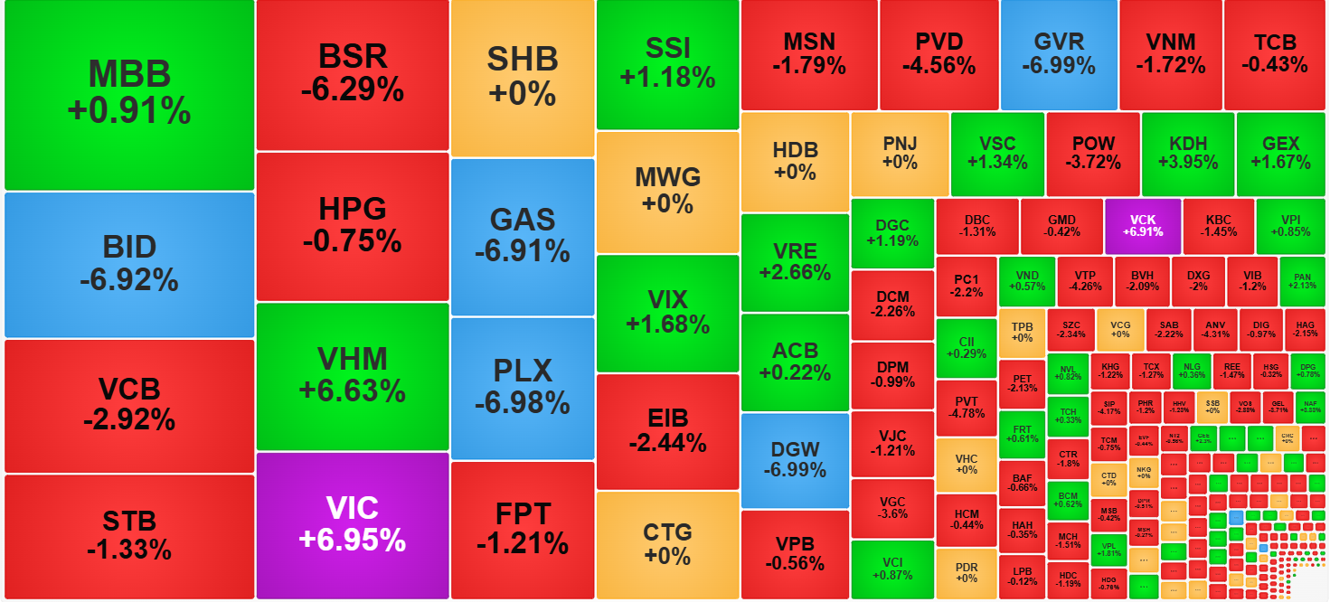 Chỉ số đại diện nhóm blue-chips còn xanh dĩ nhiên phải có trụ khác kéo lại. VIC tiếp tục trạng thái tăng kịch trần từ sáng nên không còn lực. Nhóm Vin có VHM nhích thêm 0,6% nữa so với giá chốt buổi sáng, đóng cửa tăng 6,63%. VRE tăng 2,66%, VPL tăng 1,81%, SSI tăng 1,18%, DGC tăng 1,19% là những cổ phiếu cố gắng cân bằng. Thêm nữa may mắn là các cổ phiếu giảm sàn trong rổ VN30 bị điều chỉnh trọng số vốn hóa, nhất là GAS, BID, thậm chí cả VCB (giảm 2,29%). Cổ phiếu ảnh hưởng lớn nhất đến VN30-Index lại là FPT giảm 1,21%.