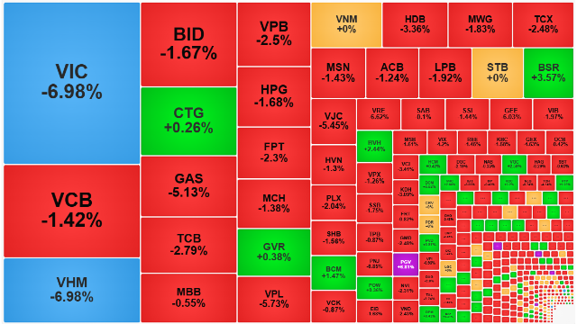 Sức ép cực mạnh từ nhóm cổ phiếu vốn hóa lớn khiến VN-Index giảm rất sâu đã ảnh hưởng nặng nề tới tâm lý chung. Hoạt động bán tháo xuất hiện, đẩy thanh khoản khớp lệnh hai sàn tăng 23% với sắc đỏ tràn ngập bảng điện.