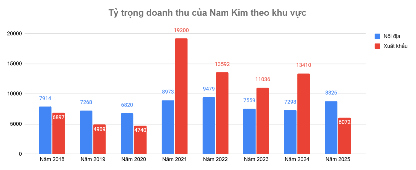 Đến năm 2025, cơ cấu doanh thu ghi nhận sự dịch chuyển rõ rệt khi khu vực nội địa lần đầu vượt xuất khẩu kể từ năm 2020. Nguyên nhân phần lớn do hoạt động xuất khẩu lao dốc mạnh. Điều này phản ánh sự cạnh tranh gay gắt trên thị trường quốc tế, cũng như hàng loạt biện pháp bảo hộ thương mại từ các thị trường lớn, buộc Nam Kim phải tái định vị chiến lược.