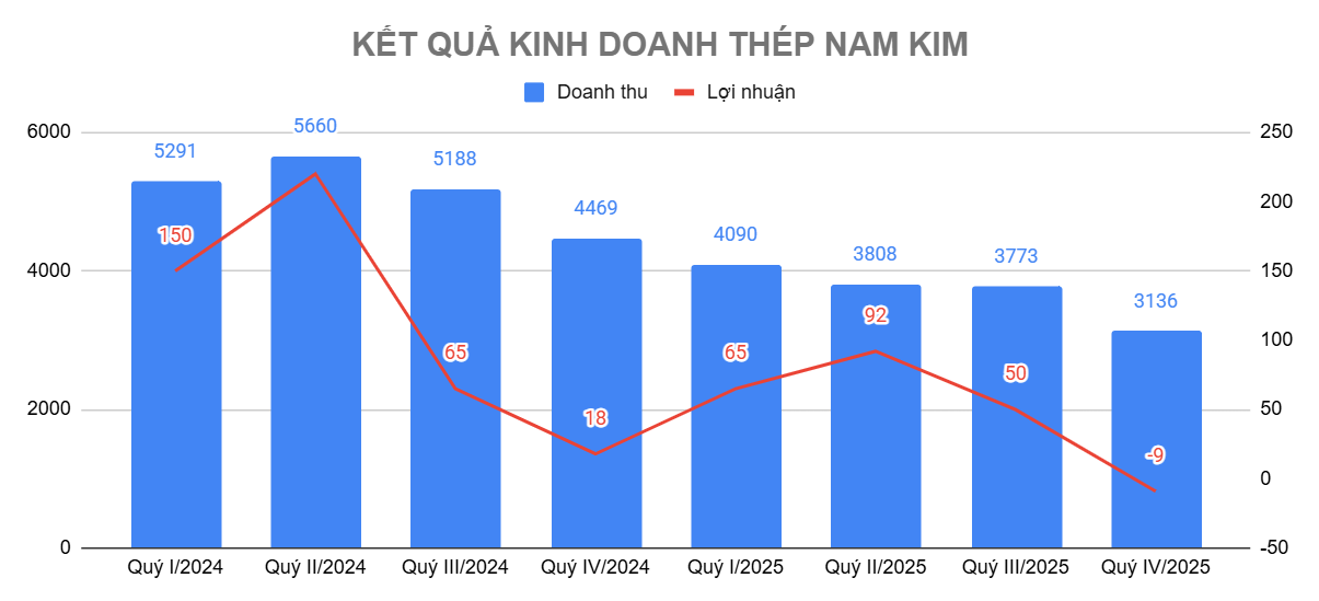 Theo báo cáo tài chính quý IV/2025, doanh thu thuần của Nam Kim đạt 3.136 tỷ đồng, giảm gần 30% so với cùng kỳ. Giá vốn giảm chậm hơn đà sụt giảm doanh thu khiến lợi nhuận gộp chỉ còn 71 tỷ đồng, trong khi cùng kỳ đạt trên 300 tỷ đồng. Biên lợi nhuận gộp theo đó lao dốc từ gần 7% xuống còn khoảng 2,3%.Sau khi trừ các chi phí, Nam Kim ghi nhận lỗ sau thuế 9 tỷ đồng, đảo chiều hoàn toàn so với mức lãi 18 tỷ đồng của quý IV/2024. Đây cũng là quý đầu tiên doanh nghiệp báo lỗ kể từ quý I/2023.