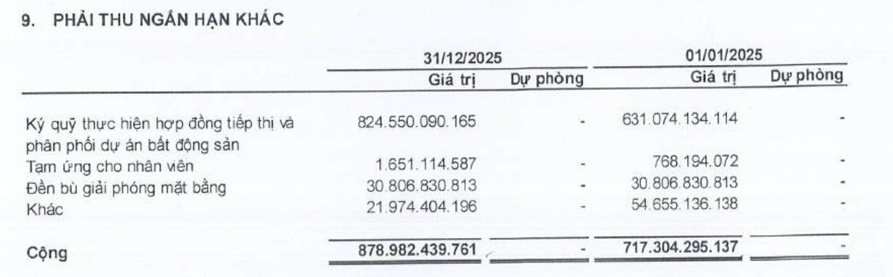 | Phải thu ngắn hạn chủ yếu là ký quỹ thực hiện hợp đồng tiếp thị và phân phối dự án bất động sản. |