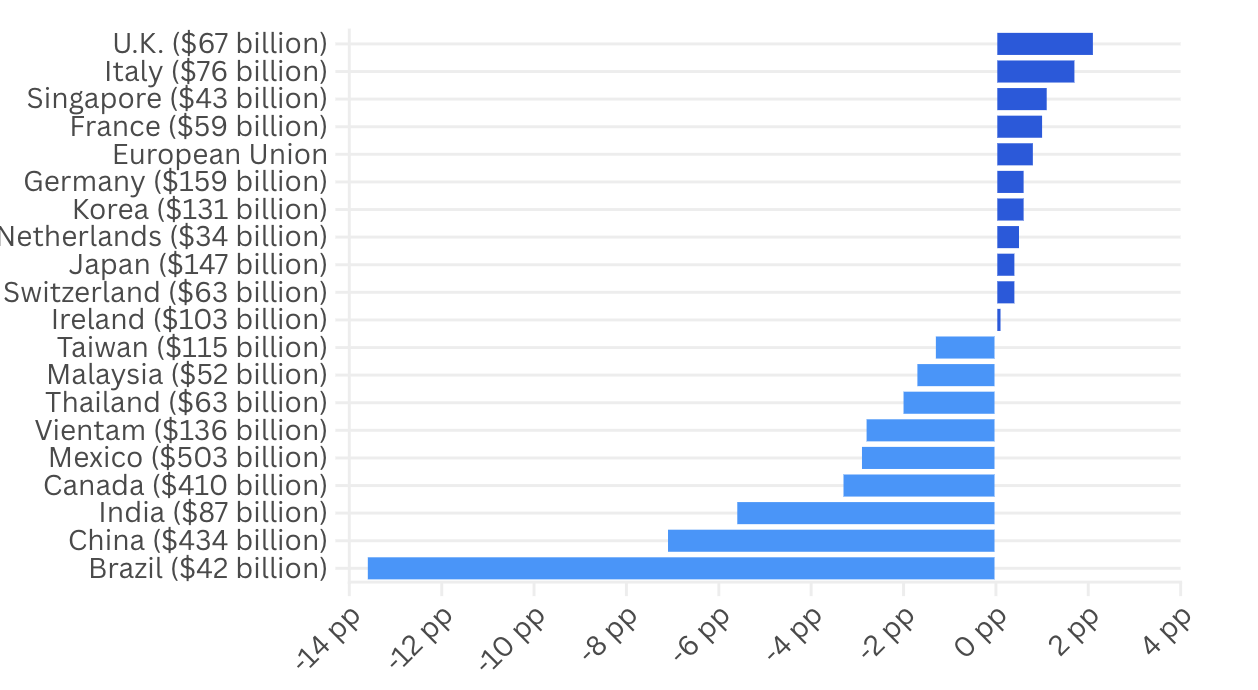 | Thay đổi mức thuế quan bình quân tính theo trọng số thương mại đối với 20 thị trường nhập khẩu lớn nhất của Mỹ (trong ngoặc là kim ngạch xuất khẩu của quốc gia/vùng lãnh thổ đó sang thị trường Mỹ năm 2024) sau khi Tổng thống Trump áp thuế quan toàn cầu 15% thay cho thuế quan IEEPA. Đơn vị: điểm phần trăm - Nguồn: GTA/CNBC. |