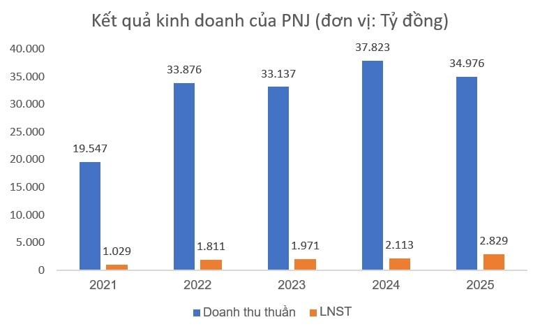 Quý IV/2025, PNJ ghi nhận doanh thu thuần đạt 9.623 tỷ đồng (+12,1% YoY) và lợi nhuận sau thuế đạt 1.219 tỷ đồng (+66,8% YoY), đánh dấu mức cao nhất từ trước đến nay của doanh nghiệp.Lũy kế cả năm 2025, doanh thu thuần ghi nhận 34.976 tỷ đồng (-7,5% YoY), trong khi lợi nhuận sau thuế đạt 2.829 tỷ đồng (+33,9% YoY).