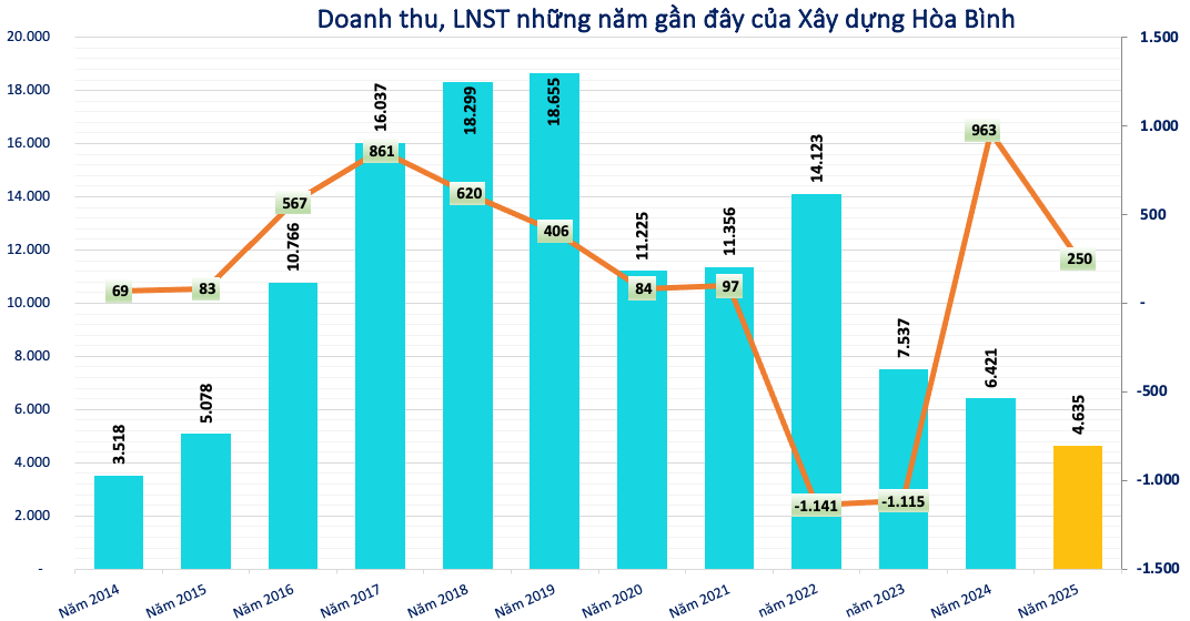 Về hoạt động kinh doanh, Hòa Bình Group vẫn đang cách khá xa giai đoạn đỉnh cao 2017–2022. Doanh thu năm 2025 đạt hơn 4.600 tỷ đồng, giảm 28% so với năm trước, đánh dấu năm thứ ba liên tiếp doanh thu đi xuống và là mức thấp nhất của doanh nghiệp trong khoảng mười năm trở lại đây.