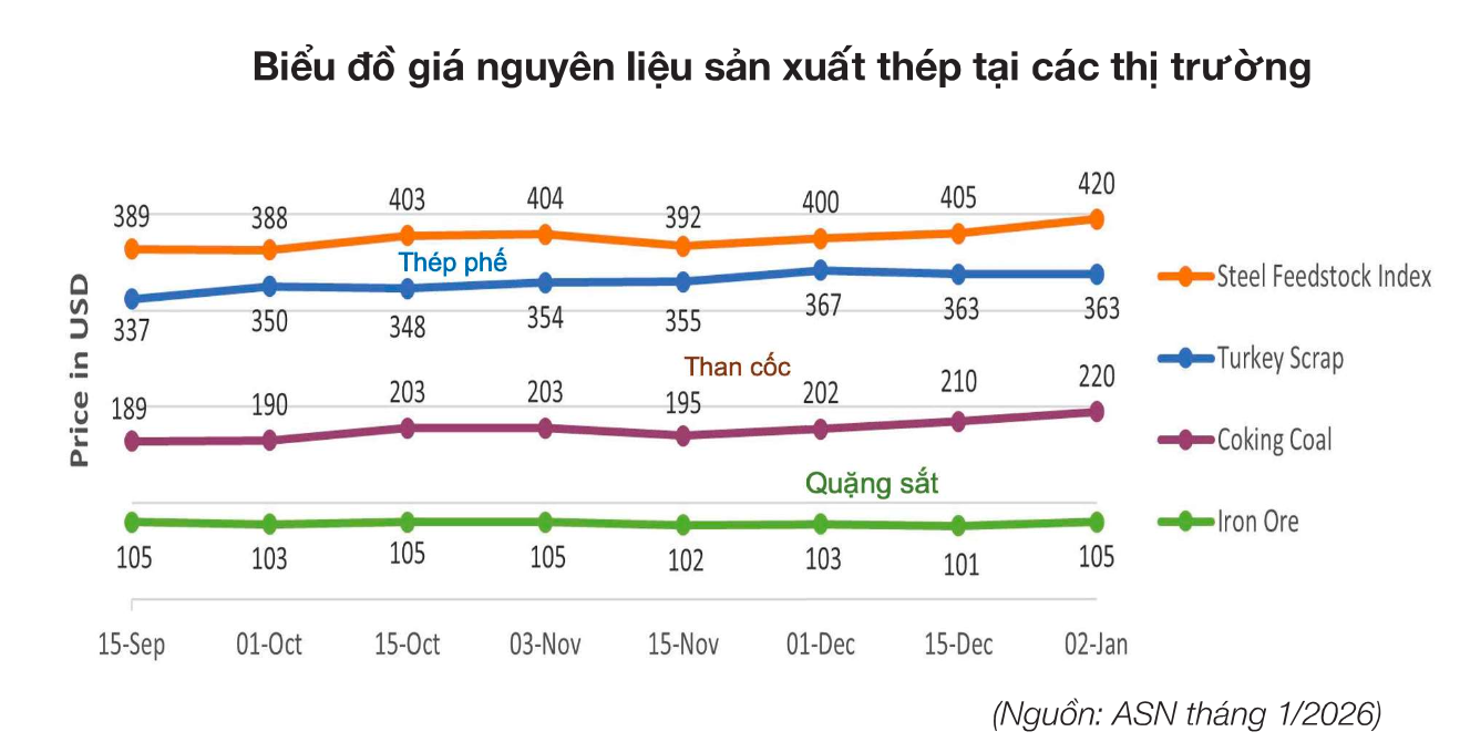 Nhìn chung giá nguyên liệu sản xuất thép giao dịch bình quân năm 2025 ổn định, xu hướng giảm. Trong tháng cuối năm 2025 giá có điều chỉnh tăng so với thời gian trước đó, nhưng vẫn giảm so với cùng kỳ.