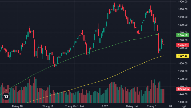 VN-Index để mất 13,37 điểm hôm nay đã gãy luôn mốc 1800 điểm, rơi xuống 1696,24 điểm. Dù vậy hiệu ứng giảm điểm chủ yếu do nhóm cổ phiếu lớn, còn dòng tiền vẫn tạo được sự phân hóa, thậm chí giao dịch tích cực tại nhiều mã vừa và nhỏ. Điều này cho thấy nỗi sợ hãi về xung đột, giá dầu không còn đồng đều.