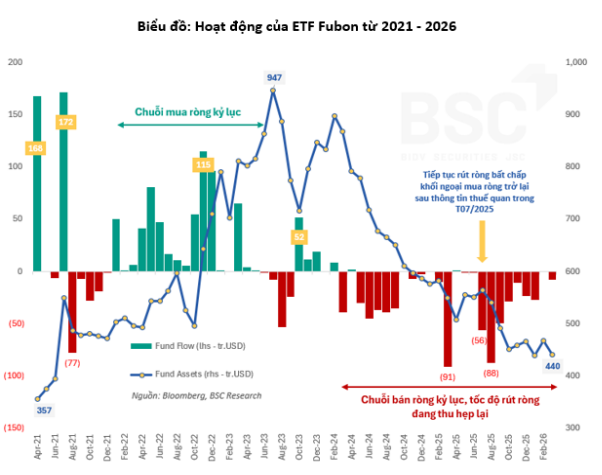 Liên quan đến dòng vốn của ETF Fubon, BSC cho biết áp lực rút ròng có thể tiếp tục diễn ra trong bối cảnh FTSE Russell chưa có thay đổi về việc sắp xếp lại bộ chỉ số FTSE Vietnam 30 cũng như chưa đưa ra hướng dẫn mới liên quan đến quá trình nâng hạng thị trường Việt Nam. Ngoài ra, xu hướng dòng vốn còn chịu ảnh hưởng bởi khẩu vị rủi ro của nhà đầu tư và các yếu tố thị trường khác.