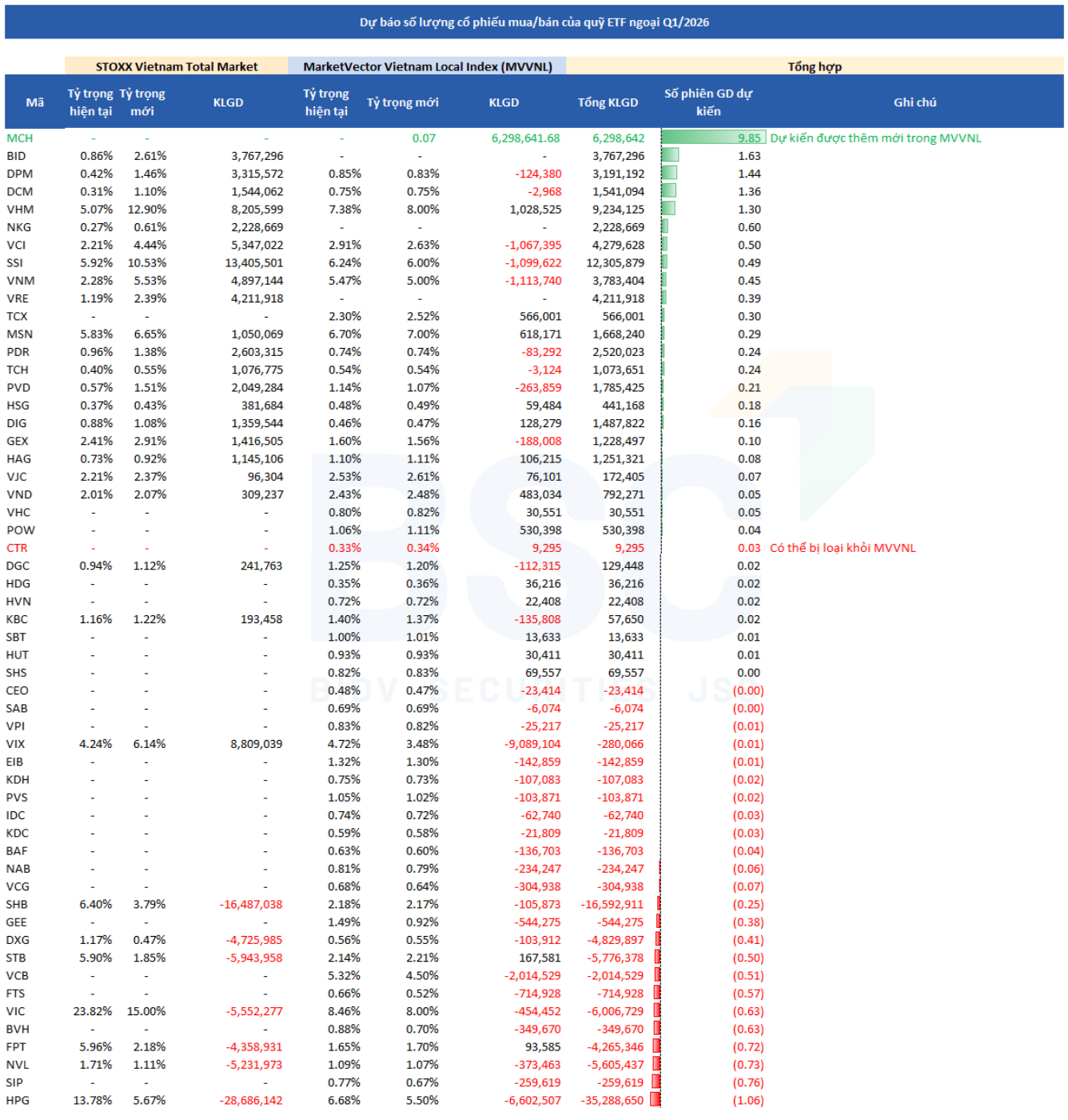 | Dự báo số lượng cổ phiếu mua/bán của quỹ ETF ngoại quý I/2026 (Ảnh: BSC) |