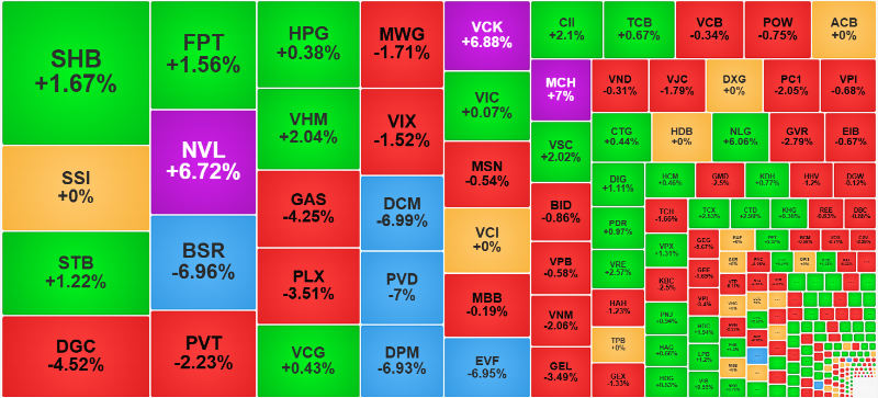 VHM tăng 2,04%, NVL tăng 6,72%, CII tăng 2,1%, NLG tăng 6,06%, DIG tăng 1,11% nhưng số cổ phiếu bất động sản đỏ cũng không ít. Hay như trong nhóm chứng khoán, VCK kịch trần, VPX tăng 1,31%, TCX tăng 2,53% thì cũng cả chục cổ phiếu khác đỏ hoặc tham chiếu.