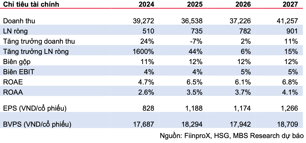 Từ những yếu tố trên, MBS đưa ra giá mục tiêu 20.000 đồng/cổ phiếu đối với HSG, cao hơn khoảng 25% so với thị giá hiện tại, cho thấy dư địa tăng trưởng vẫn còn, dù con đường phục hồi có thể không bằng phẳng trong ngắn hạn.