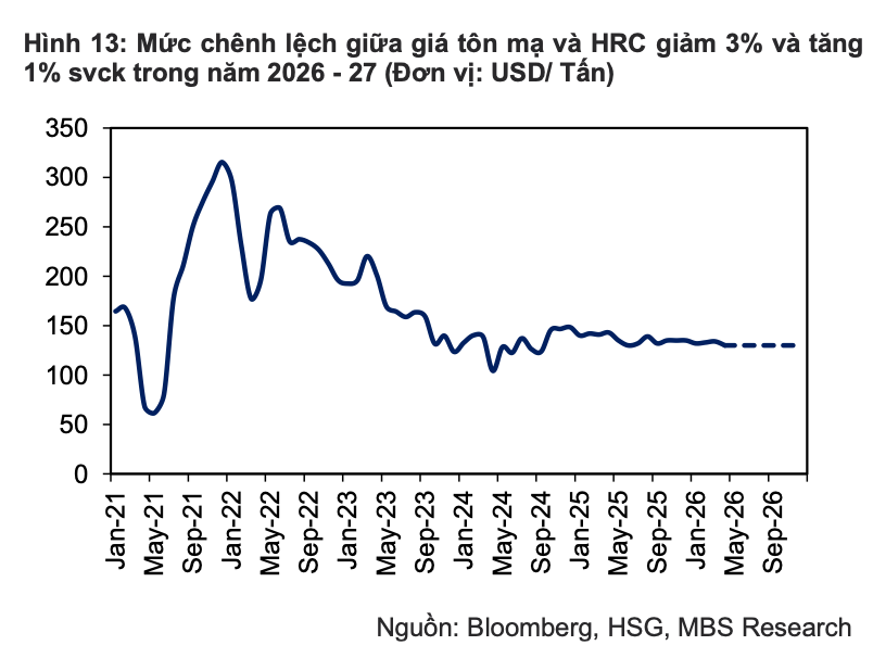 Về biên lợi nhuận, áp lực vẫn duy trì trong năm 2026 khi giá HRC tăng nhanh hơn giá tôn mạ. Tuy nhiên, sang năm 2027, khi giá thép ổn định hơn và doanh nghiệp có thể chủ động tồn kho đầu vào, biên lợi nhuận được kỳ vọng cải thiện trở lại.