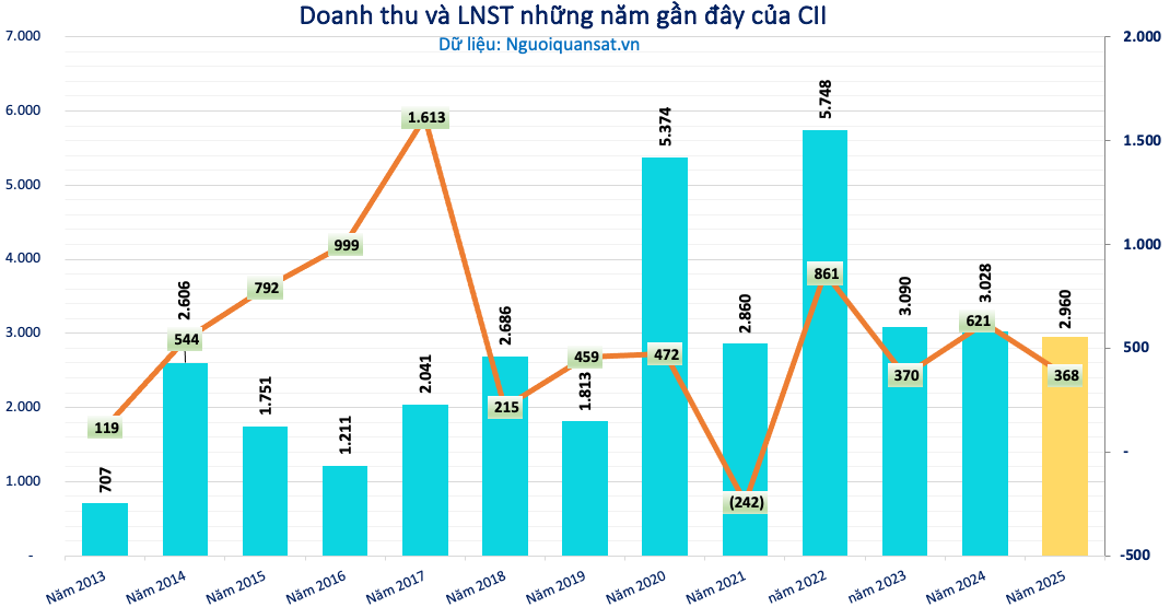 Về kết quả kinh doanh, năm 2025, CII đạt 2.960 tỷ đồng doanh thu, giảm 2,2% so với năm trước đó. Lợi nhuận sau thuế đạt 368 tỷ đồng, giảm sốc hơn 40% so với cùng kỳ.