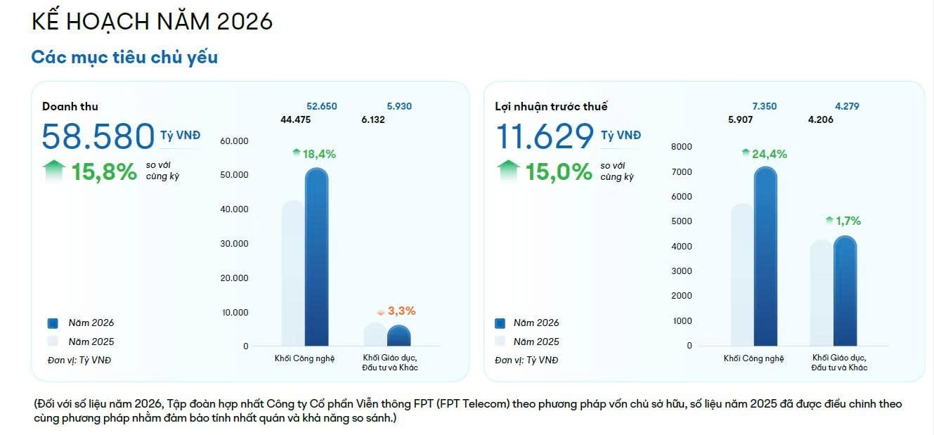 Năm 2026, FPT đặt mục tiêu doanh thu 58.580 tỷ đồng và lợi nhuận trước thuế 11.629 tỷ đồng.