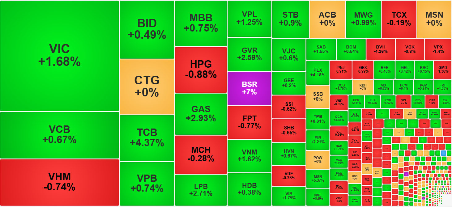 Ngược lại, dòng tiền vẫn hành động mạnh mẽ ở nhiều cổ phiếu khác. Gần 20 cổ phiếu xuất hiện thanh khoản vượt ngưỡng trăm tỷ đồng với mức tăng giá trên 1%. Blue-chips xuất hiện khá nhiều với VIC tăng 1,68%, TCB tăng 4,37%, VNM tăng 1,62%, GAS tăng 2,93%, PLX tăng 4,18%... Thống kê rổ VN30 có 11 mã đóng góp vào nhóm tăng tốt nhất, chỉ số đại diện tăng 0,69%.