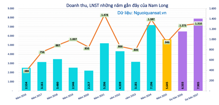 VCBS kỳ vọng doanh thu năm 2026 của Nam Long tiếp tục tăng 15% lên 6.503 tỷ đồng và lợi nhuận tăng mạnh hơn, đến 35%, lên 1.273 tỷ đồng. Nhìn xa hơn, sang năm 2027, VCBS dự báo Nam Long có thể đạt 7.900 tỷ đồng doanh thu và lợi nhuận sau thuế khoảng 1.310 tỷ đồng.