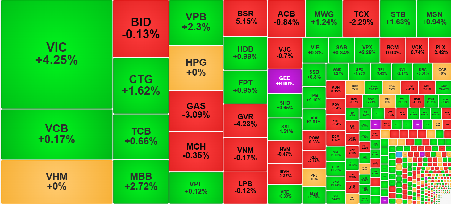 Dù vậy mặt bằng giá của nhóm VN30 thực sự đã suy yếu, chỉ còn 9 mã tăng hơn 1% trong khi phiên sáng là 11 mã. Nhóm tăng tốt vẫn là các cổ phiếu tầm trung và có ảnh hưởng nhiều hơn tới VN30-Index thay vì VN-Index. Tiêu biểu là DGC tăng 2,24%, TPB tăng 2,19%, STB tăng 1,63%... Trong nhóm trụ ngoài VIC chỉ thêm MBB tăng 2,72%, VPB tăng 2,3% và CTG tăng 1,62% là đáng kể. VN30-Index đóng cửa tăng 0,98% với thanh khoản chỉ chiếm 48,2% tổng giá trị khớp lệnh sàn HoSE.