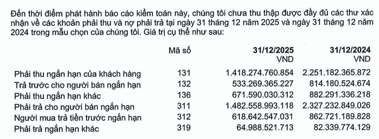 Ngoài ra, đến thời điểm phát hành báo cáo kiểm toán, đơn vị kiểm toán chưa thu thập được đầy đủ các thư xác nhận về các khoản phải thu và nợ phải trả tại thời điểm 31/12/2025 và 31/12/2024. Trong đó, tính tới cuối năm 2025, phải thu ngắn hạn của khách hàng 1.418,27 tỷ đồng; trả trước cho người bán ngắn hạn 533,3 tỷ đồng; phải thu ngắn hạn khác 671,59 tỷ đồng; phải trả cho người bán ngắn hạn 1.482,6 tỷ đồng; người mua trả tiền trước ngắn hạn 618,6 tỷ đồng; và phải trả ngắn hạn khác 64,99 tỷ đồng.
